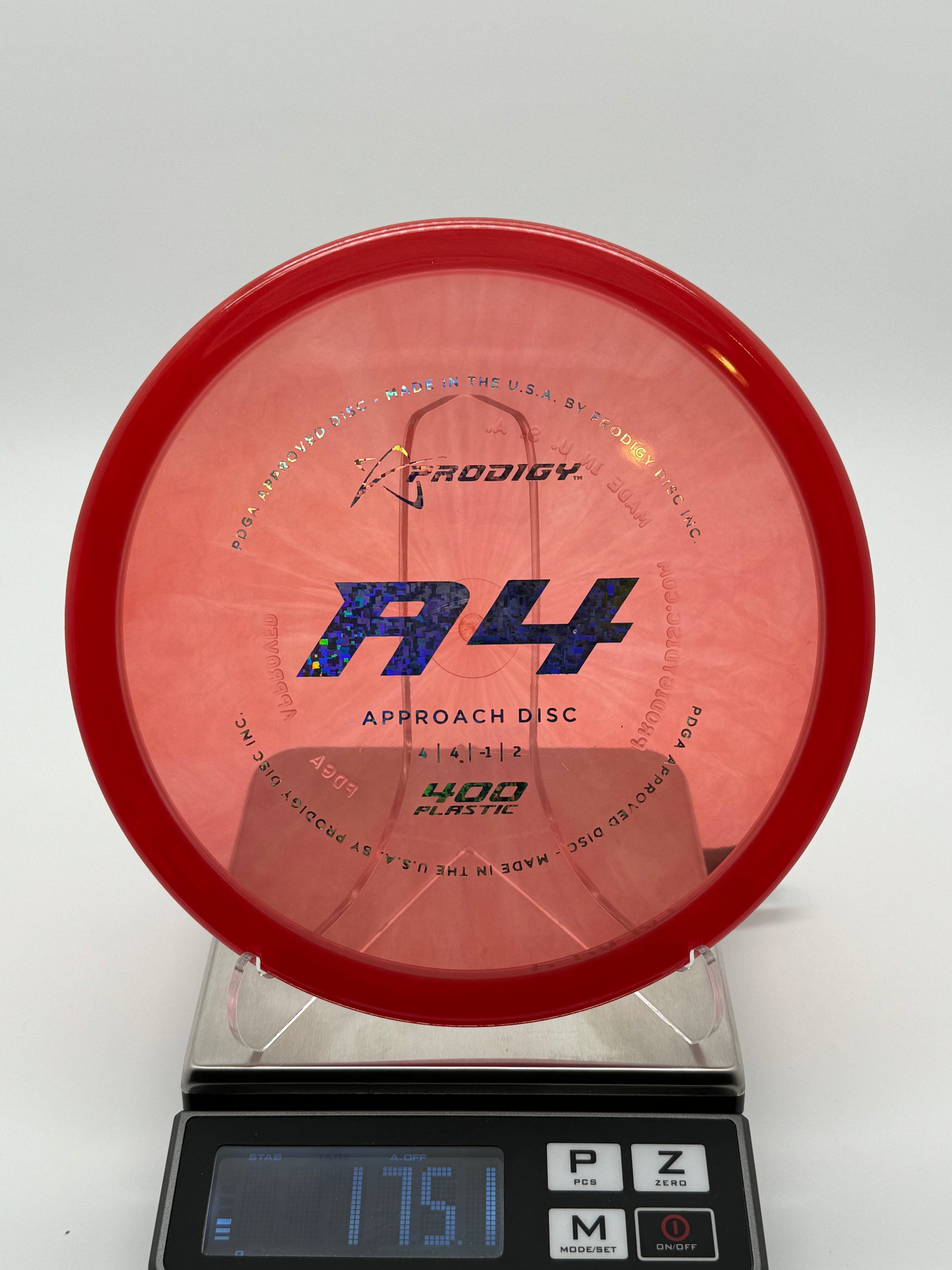 The Prodigy Disc A4 is the latest in our range of approach discs. The A4 is a slightly over stable disc that fills the distance gap between midranges and putters and is designed for all skill levels. The disc is consistent and reliable in moderate wind conditions and perfect for short approach shots. It works equally as well for backhand or sidearm throwers. The A4, like the A3 has a bead on the rim. You can expect it to fly slightly less stable than the A3 with an extra 40-50 feet in distance.
